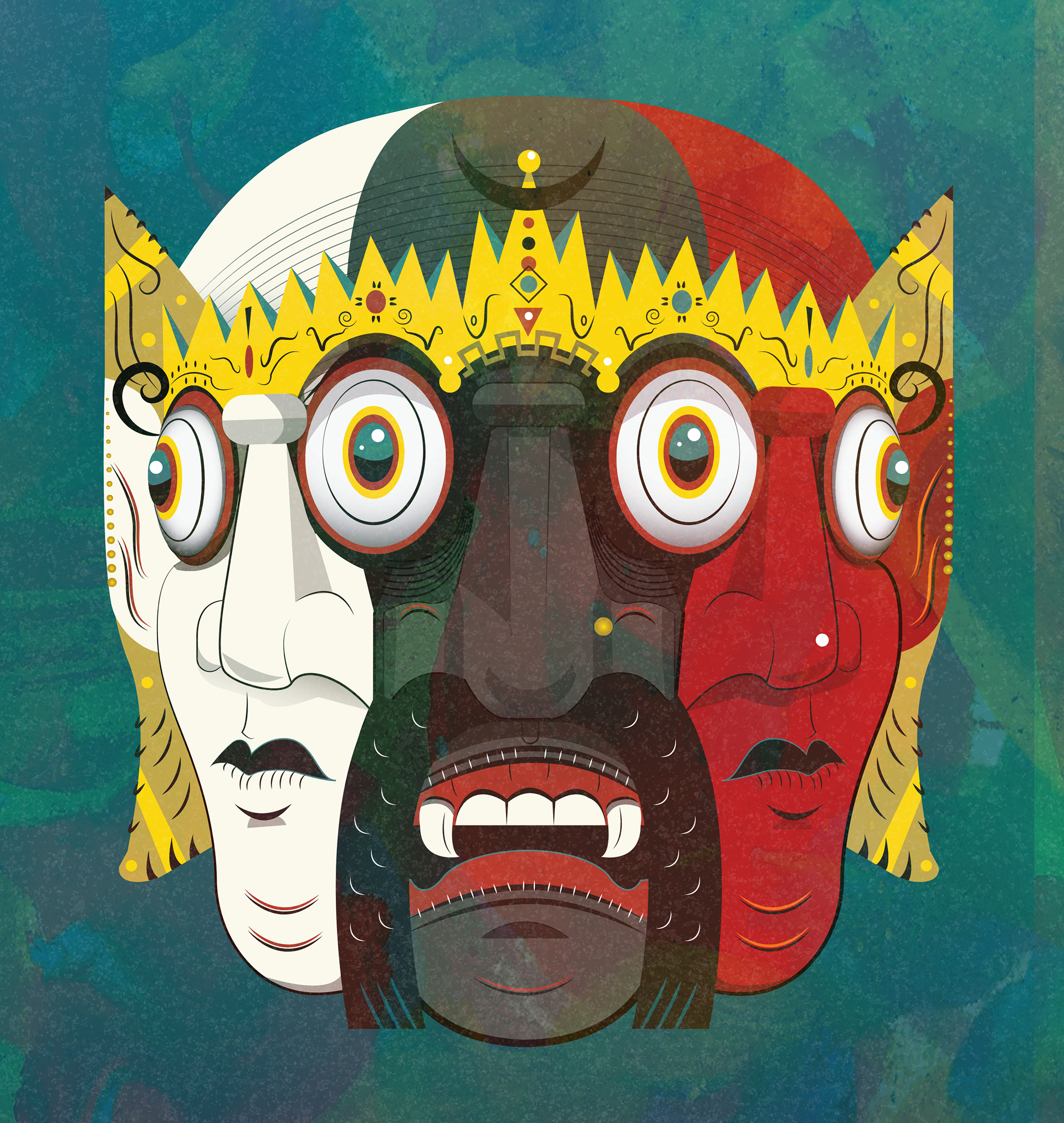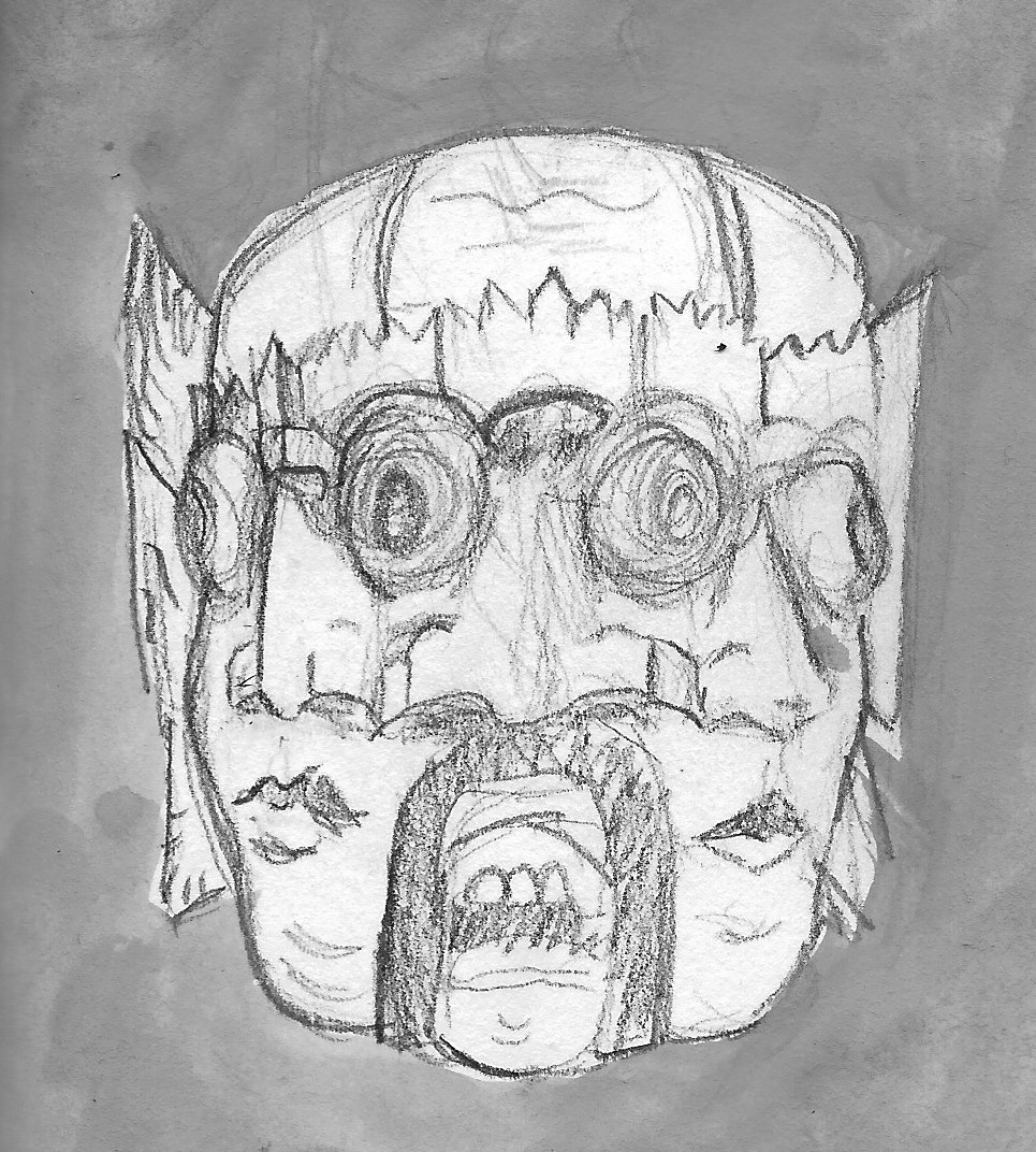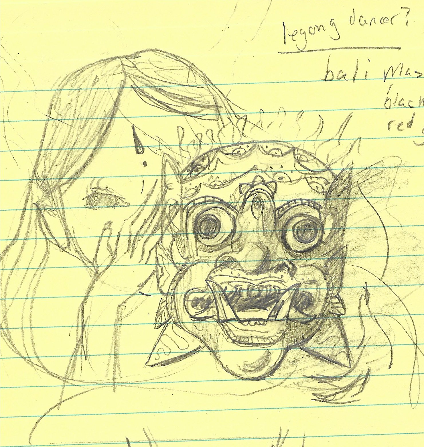 Inspiration Balinese Dragon mask (left) and thumbnail sketch.
